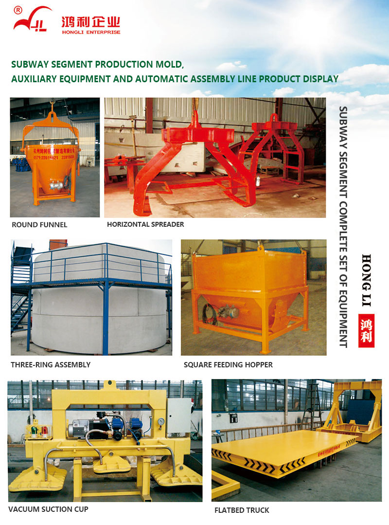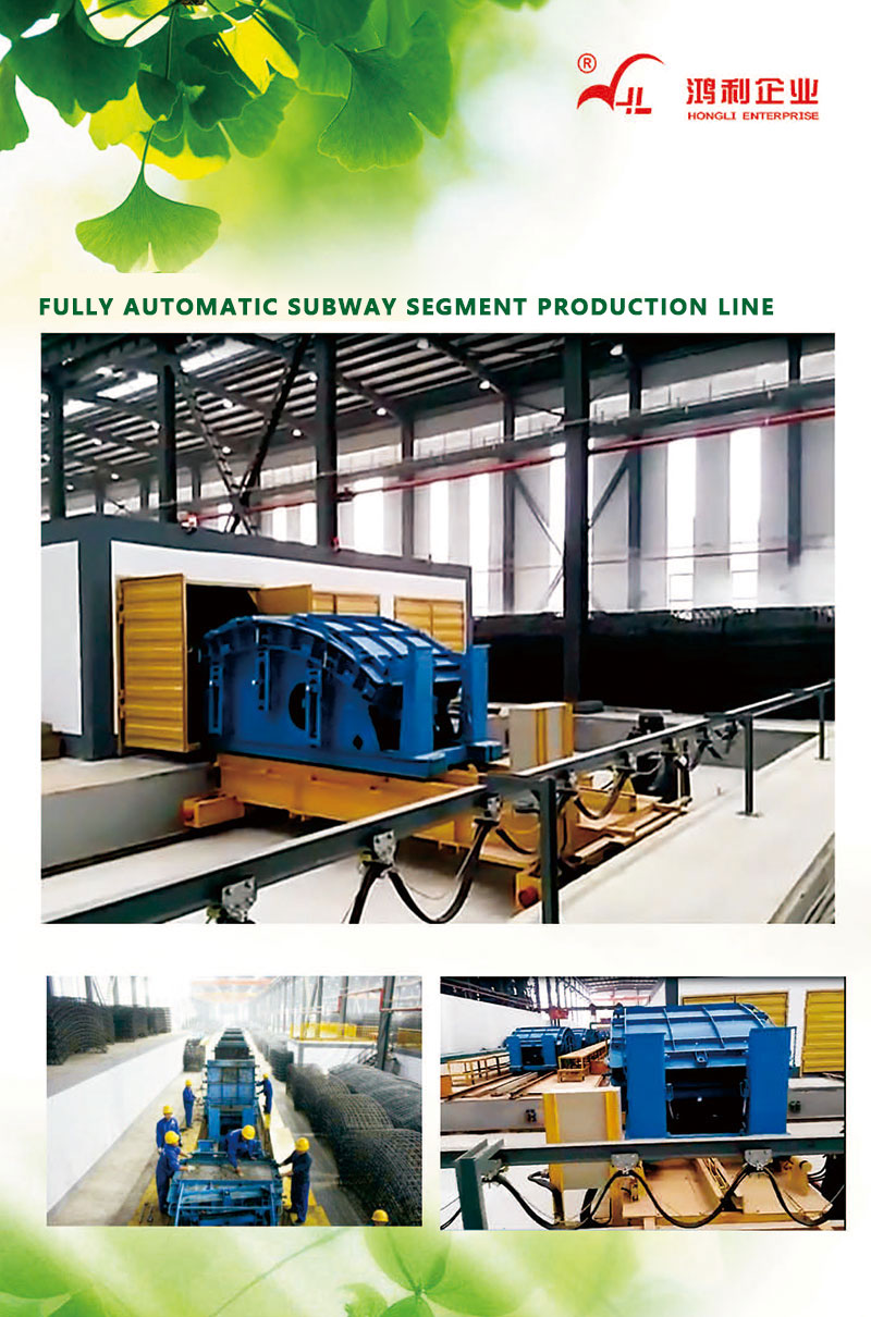 This project has been developed by itself. The project uses PLC control technology, field bus technology, sensor technology and other advanced automatic control technologies to achieve the requirements of shield segment production automation. At the same time, the project adopts: the hydraulic one-way transmission mode is adopted for the traveling device to ensure the smooth operation of the mold car on the assembly line; the top of the hydraulic one-way transmission is equipped with a one-way thrust trolley, which pushes the mold trolley to run forward through the hydraulic cylinder; The self-developed airbag vibration isolation platform or multi-wheeled overhead platform is set up in the vibration room, so as to avoid the energy loss caused by the transmission of energy to the ground during vibration, and reduce the damage to the mold wheel bearing. At the same time, the forming accuracy of the segment is guaranteed to the greatest extent; the end segment handling unit is equipped with a mechanical self-clamping horizontal spreader, which is safe and reliable. Combined with the self-developed mechanical segment turning platform (using worm gear reducer and rack-and-pinion transmission mechanism), it is more efficient and reliable than the traditional turning platform, so that the segment is in a vertical state, and then the self-designed lateral spreader is used. The segment is stably hoisted to the self-developed rail flatbed car, which is combined with frequency conversion technology and wire rope traction, and has the characteristics of stable running and long service life. A complete set of testing equipment such as impermeability test bench, bending and pull-out test bench, and three-ring assembly bench are also set up outside the site.